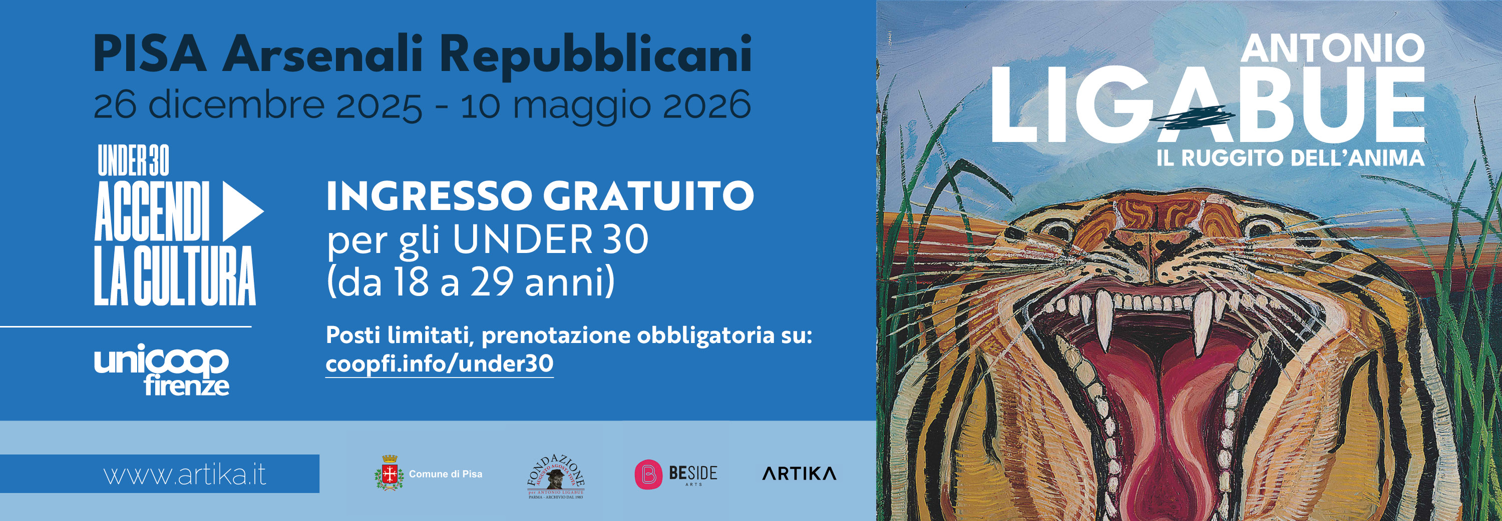 Prodotta da ARTIKA di Daniel Buso ed Elena Zannoni, con il patrocinio del Comune di Pisa e della Fondazione Augusto Agosta Tota per Antonio Ligabue e curata da Mario Alessandro Fiori, segretario generale della Fondazione, unitamente alla Direzione Artistica di Beside Arts, la mostra racconterà con oltre 80 opere la vita, la psiche e la storia tormentata di questo affascinante artista.